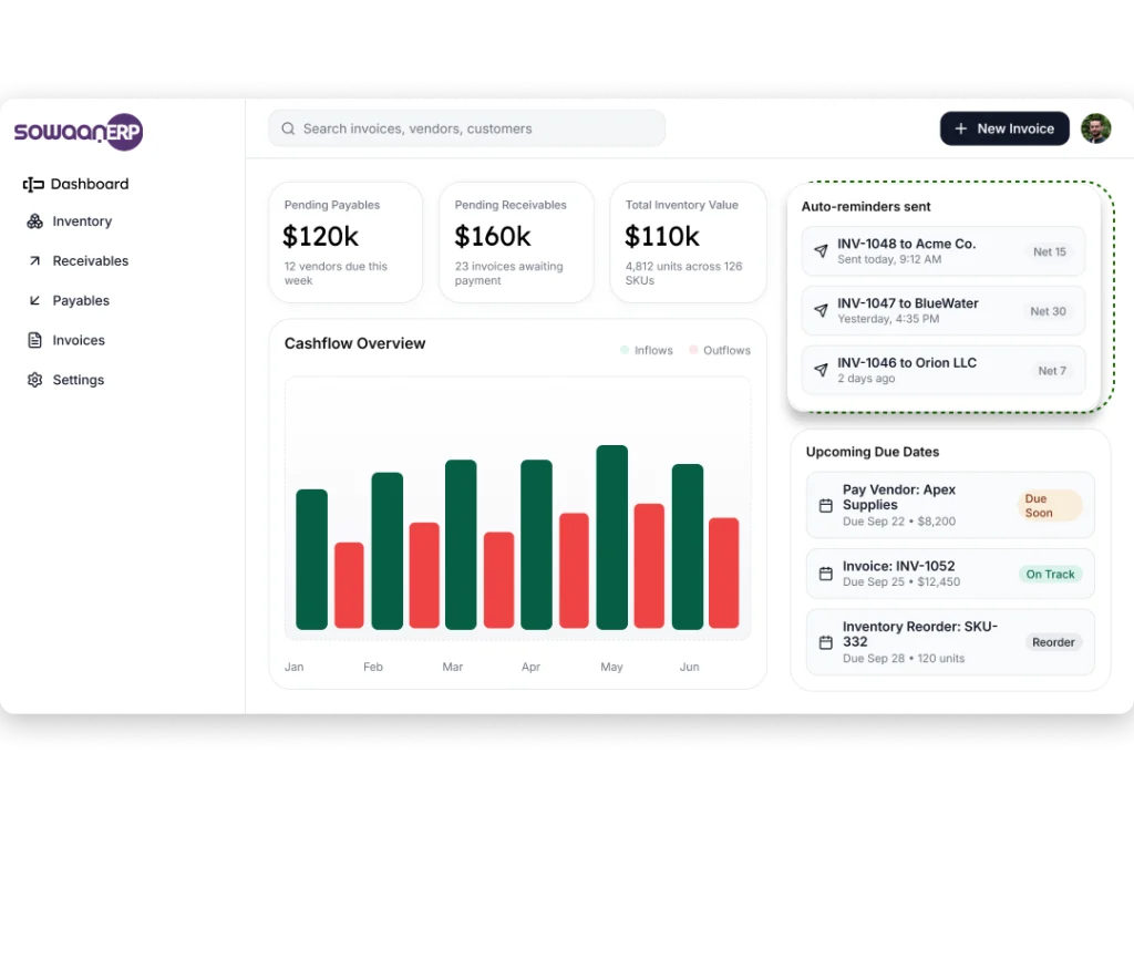 Business sustainability is dependent on good cash flow management. SowaanERP offers features to track and predict cash flow, enabling companies to make sound financial choices and manage the working capital effectively.
